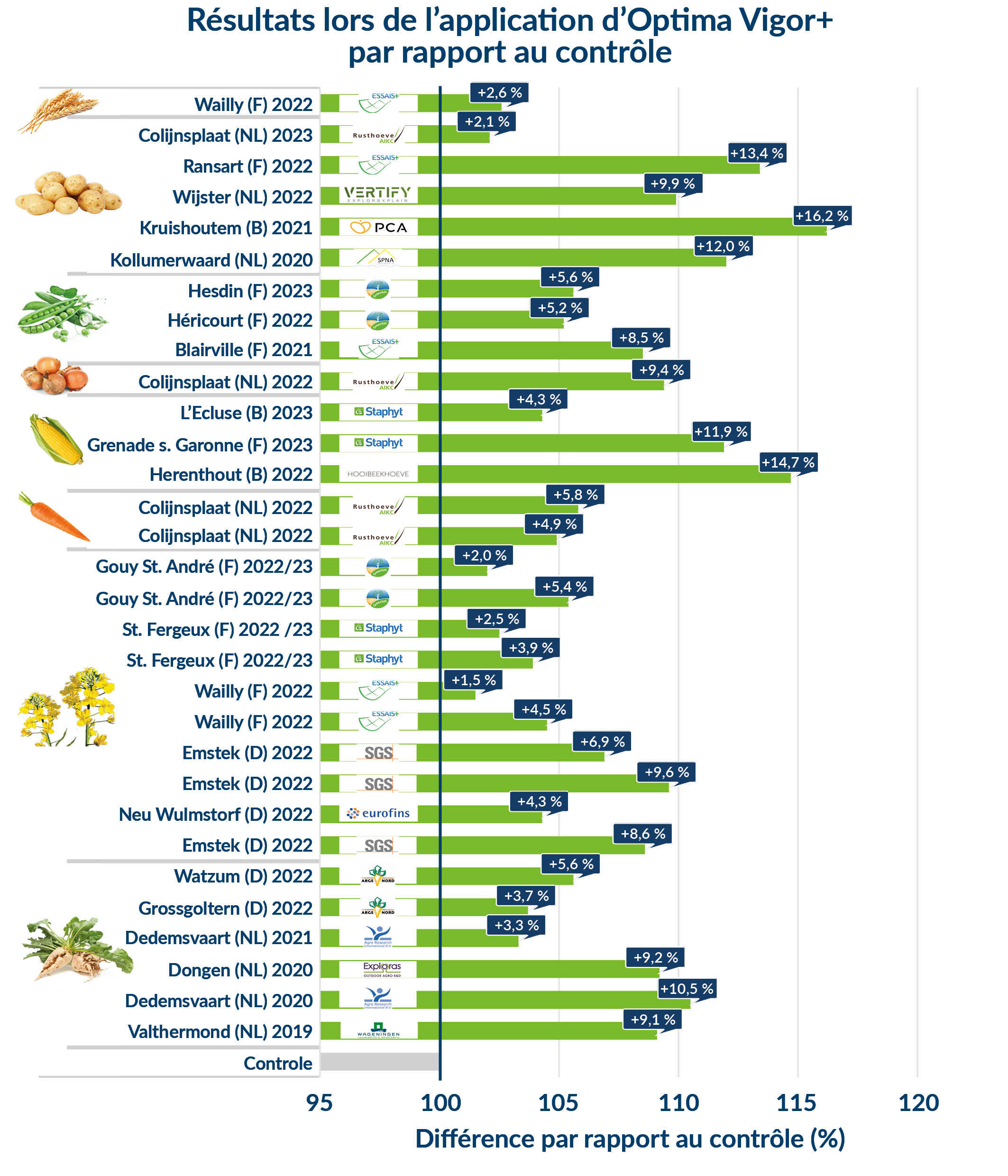 Soiltech accorde une grande attention à fournir les preuves de l'efficacité de ses produits. Ci-dessus un aperçu des principaux résultats de nos essais. Ils montrent que l'Optima Vigor+ apporte une valeur ajoutée systématique par rapport à la référence pratique, dans plusieurs cultures.